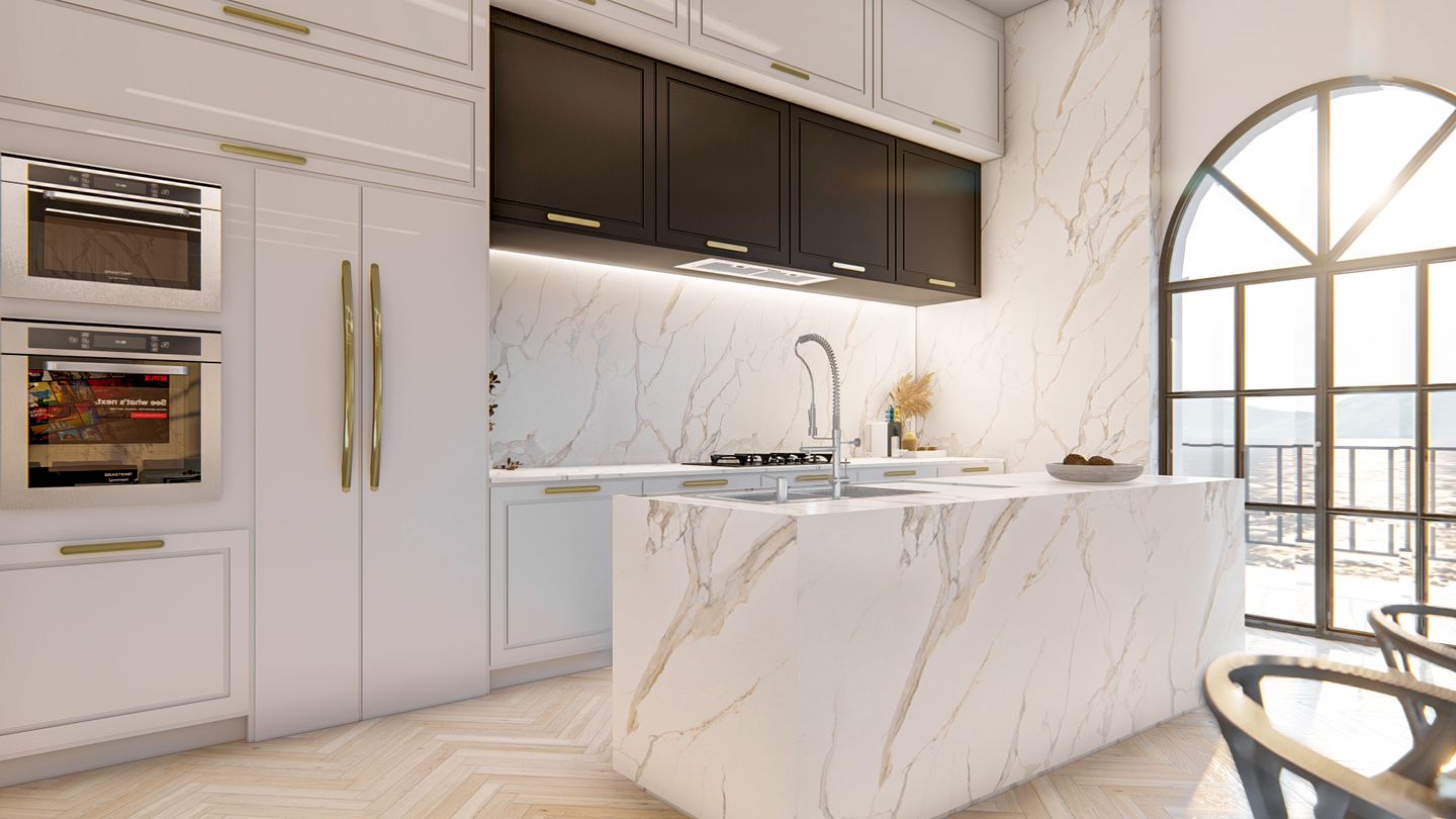 La zona giorno è stata suddivisa in due aree: il salone e la cucina. Il salone, situato nella zona 1 con vista panoramica sul mare, è stato arredato con un divano a L, due poltrone e un tavolino da caffè. La cucina, situata nella zona 2, è stata progettata con una penisola e un’isola, per sfruttare al meglio la luce naturale e la vista sul mare.