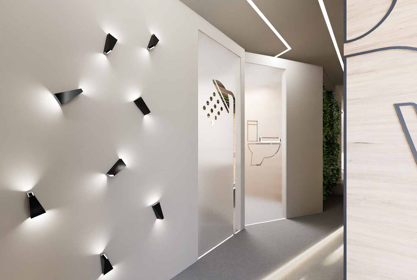 Particolare attenzione è stata rivolta alla scelta delle finiture, con l’uso di cartongesso per le divisioni tra le postazioni, piatti doccia integrati nel pavimento e porte in vetro satinato con icone a specchio. Un dettaglio non da meno è l’uso di tecnologia contactless per l’apertura delle porte e i miscelatori, e un sistema di illuminazione a LED incassato nel controsoffitto.