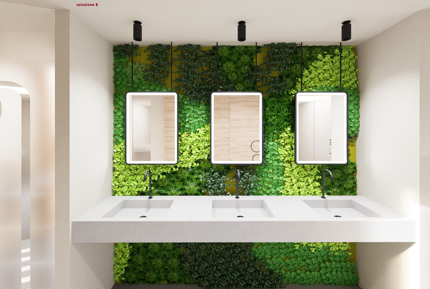 L’architetta ha proposto due soluzioni planimetriche. Nella soluzione A, il bagno per disabili funge da quinta, guidando i clienti verso la zona bagni. Quest’area presenta grandi icone stilizzate per identificare facilmente il tipo di bagno, superando così qualsiasi barriera linguistica. La soluzione B, invece, modifica il progetto fornito dal cliente e prevede la presenza di lavabi all’interno dei singoli locali.