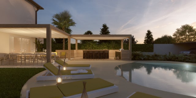 La pérgola que cubre la zona de la barra/barbacoa, colocada en continuidad con el muro principal de la casa, está cerrada en la parte superior y lateral por una estructura en tableros de abeto laminado de color natural. Aquí también juega un papel muy importante la vegetación, tanto para darle un toque exótico al proyecto, gracias a la presencia de palmeras con otros troncos, como para garantizar la adecuada protección del viento y de las miradas indiscretas del espacio, gracias a la presencia de setos de hoja perenne de mediana altura.