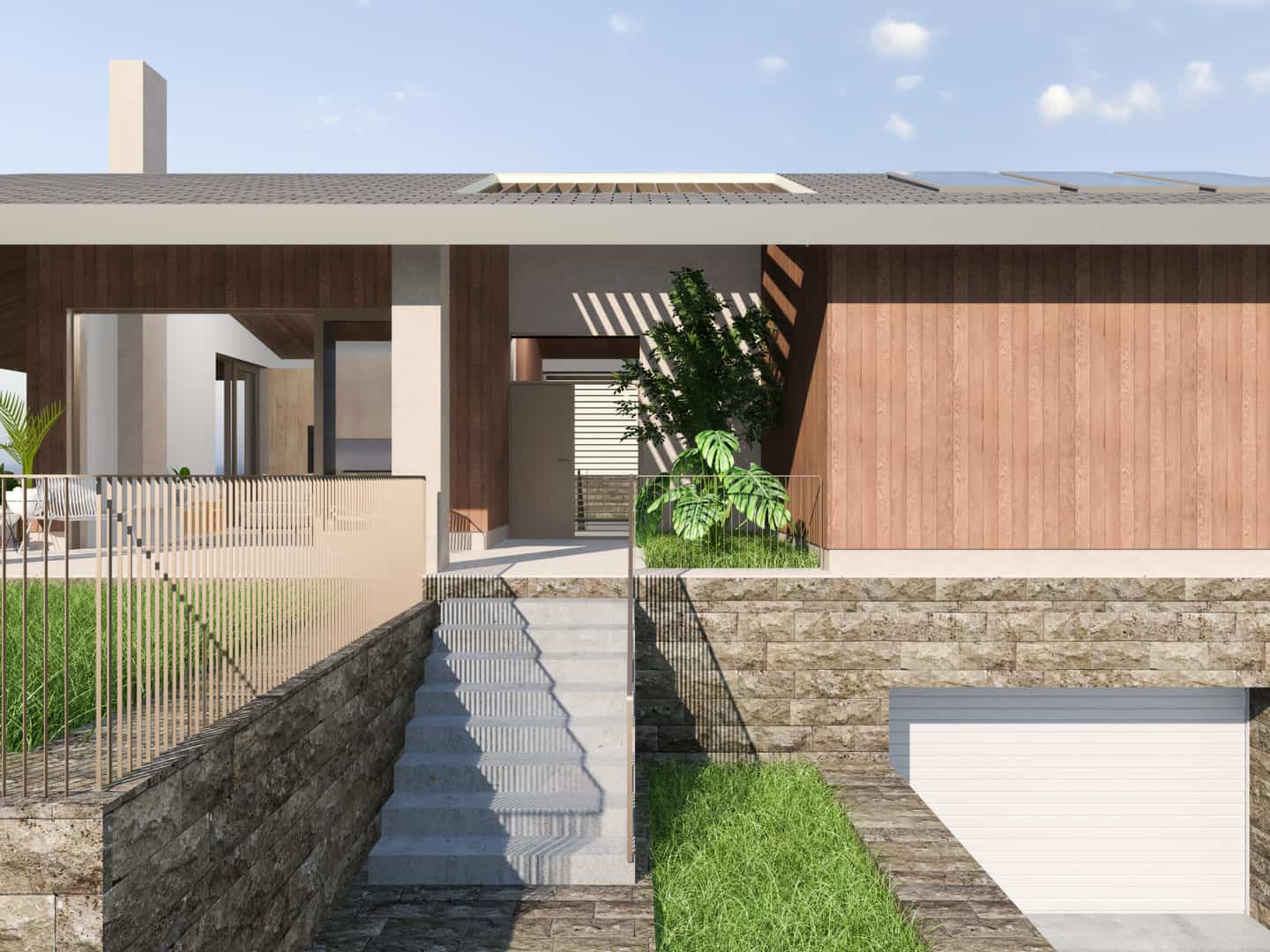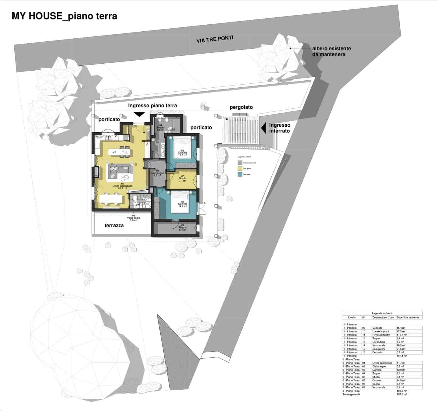 Analicemos la propuesta ganadora. Como es obvio, la petición inicial de nuestro cliente se respeta plenamente, el proyecto propuesto contempla de hecho una solución de vivienda dispuesta en un nivel de sótano con una superficie de aproximadamente 200 metros cuadrados y el nivel superior, habitable, con una superficie de aproximadamente 120 metros cuadrados. El nivel inferior permite conectar los desniveles orográficos presentes en la parcela, tal y como se indica en el resumen, para mejorar la accesibilidad, y consiste en un amplio espacio que se utilizará como garaje para motos y cobertizo.