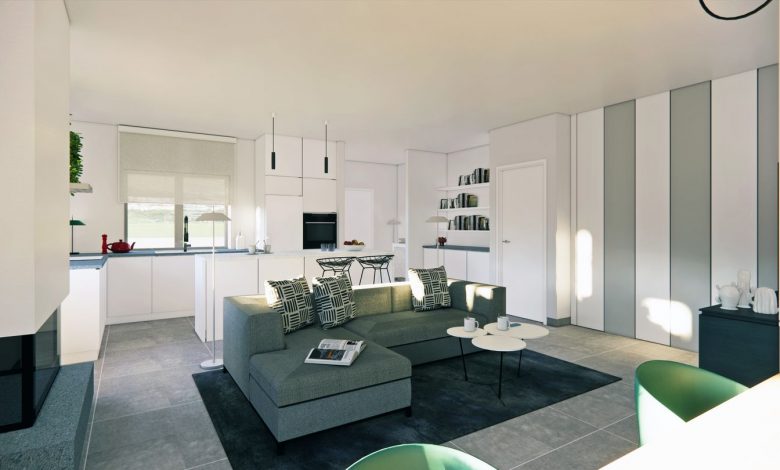 Desde aquí accedemos al interior del piso situado en la planta superior dispuesto como es debido en un solo nivel. Al entrar en la zona de estar de planta abierta, nos encontramos con un diseño muy funcional, como se pedía. zona de estar, comedor y cocina abierta con isla.