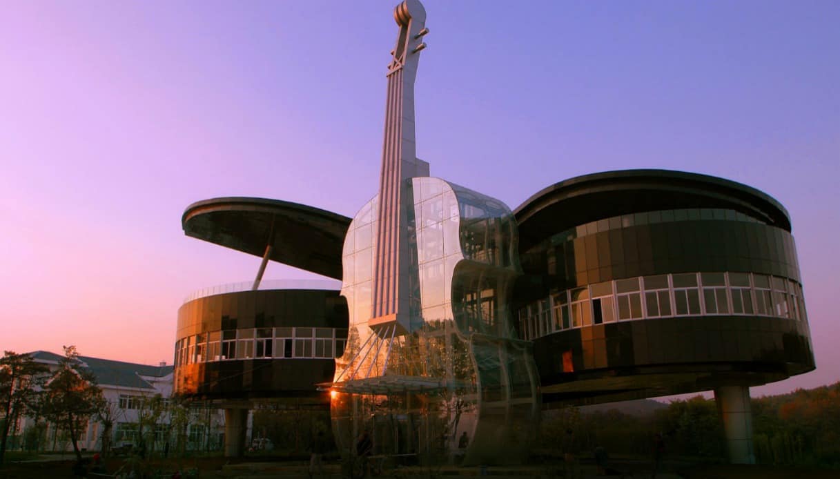 Situato nel distretto di Shannan nella città di Huainan, in Cina, questo edificio a vetri a forma di violino appoggiato a un pianoforte è stato completato nel 2007.