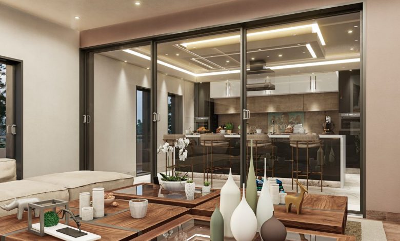 Il cuore dell’appartamento progettato è un grande open space, un unico ambiente dalle funzioni e dalle aree ben raccolte e definite, grazie alla posizione strategica dei mobili e all’utilizzo di un doppio infisso scorrevole in vetro e di divisori a listelli verticali. Questo importante elemento architettonico interno dà continuità all’ambiente e allo stesso tempo permette di godere della luce naturale ogni giorno. Il pavimento in legno scuro dona una sensazione di comfort e allo stesso tempo un tocco di eleganza. Un set di divani rivestiti in diverse tonalità di beige è stato posizionato di fronte alla finestra, dove si trova anche un tavolino dal design minimalista.