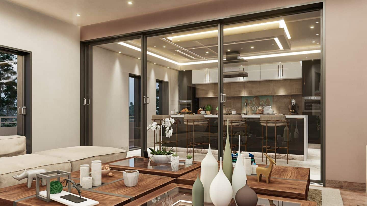 La cucina è separata dalla zona giorno da una porta scorrevole in vetro, il che rende facile socializzare con gli ospiti pur potendo preparare il cibo. In fondo al soggiorno si trova la zona TV, con comodi posti a sedere e un grande televisore.