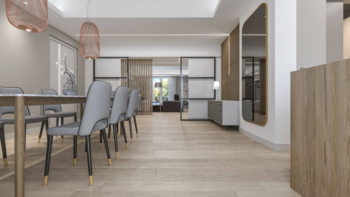 Vivendo questo progetto, quando si entra per la prima volta nell’appartamento, si viene accolti da un’ampia zona giorno. Alla sinistra c’è la sala da pranzo e alla destra la cucina.