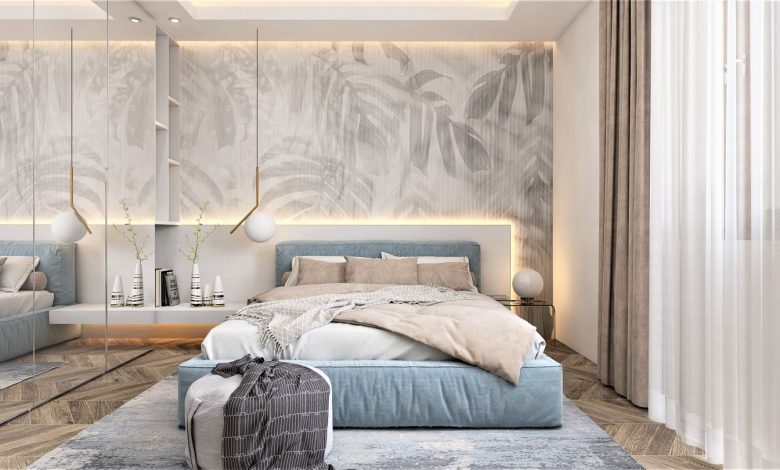 Per la camera da letto viene proposto un design calmo e rilassante, utilizzando colori tenui e arredi di grandi dimensioni. Il fulcro della stanza è il grande letto imbottito; posizionato contro una parete un armadio con ante a specchio per dare un senso di profondità e luminosità all’ambiente. Vengono proposte anche quattro diverse opzioni di carta da parati per dare un tocco personalizzato alla stanza creando un’atmosfera chic e romantica.