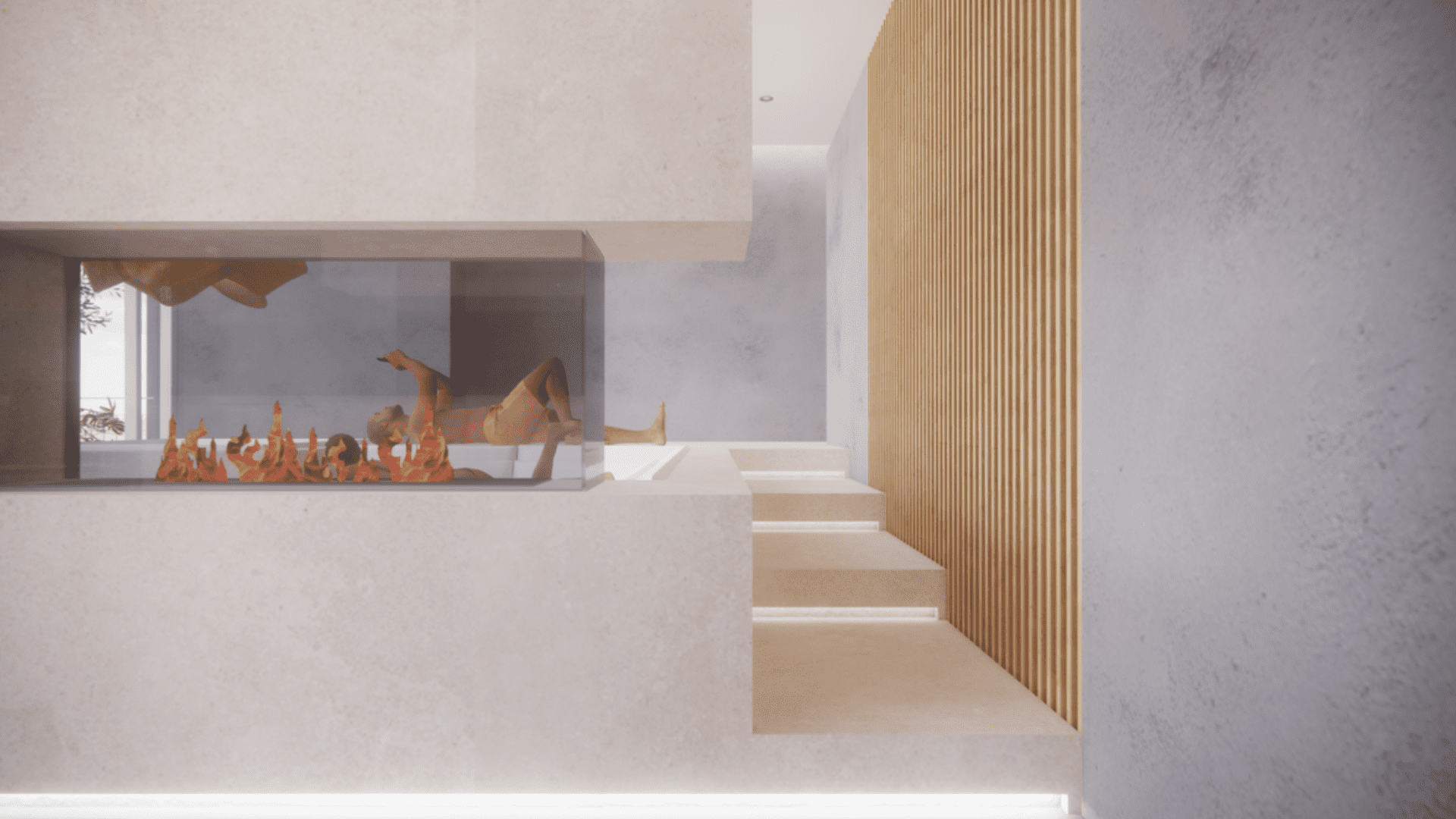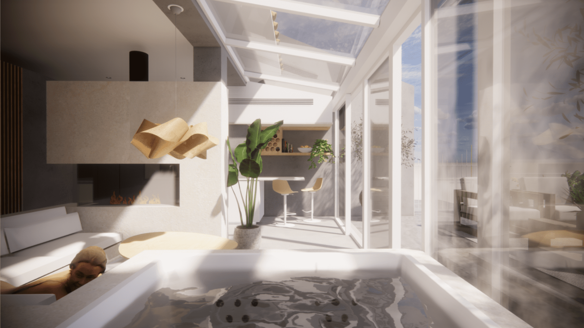 Un elemento distintivo del progetto di Bertazzoni è l’attenzione al trinomio docce cromoterapiche, caminetto e mini-infinity pool, che sono sempre visibili e in comunicazione diretta tra loro. Grazie a vetri opalescenti scorrevoli, gli ospiti possono passare comodamente da un’area all’altra, godendo del bagliore del caminetto, oppure, con un semplice tocco, rendere le vetrate opache per garantire la massima privacy.