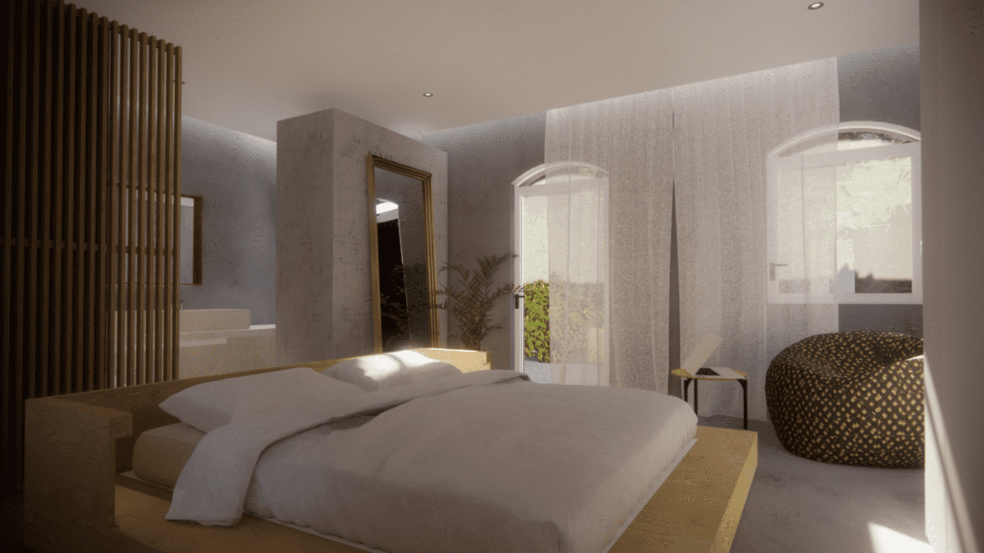 L’obiettivo è creare una suite di lusso completa di minipiscina interna, area living, cucina e un’ampia area bagno, il tutto in un ambiente funzionale e di grande impatto visivo. Il progetto ideale dovrà fondere armoniosamente materiali pregiati come la pietra color corda e il legno, con richiami alla splendida location marittima della penisola Sorrentina. Gli spazi interni saranno separati da filtri in legno, in modo da mantenere una percezione di continuità e ampiezza, senza rinunciare all’intimità della zona notte.