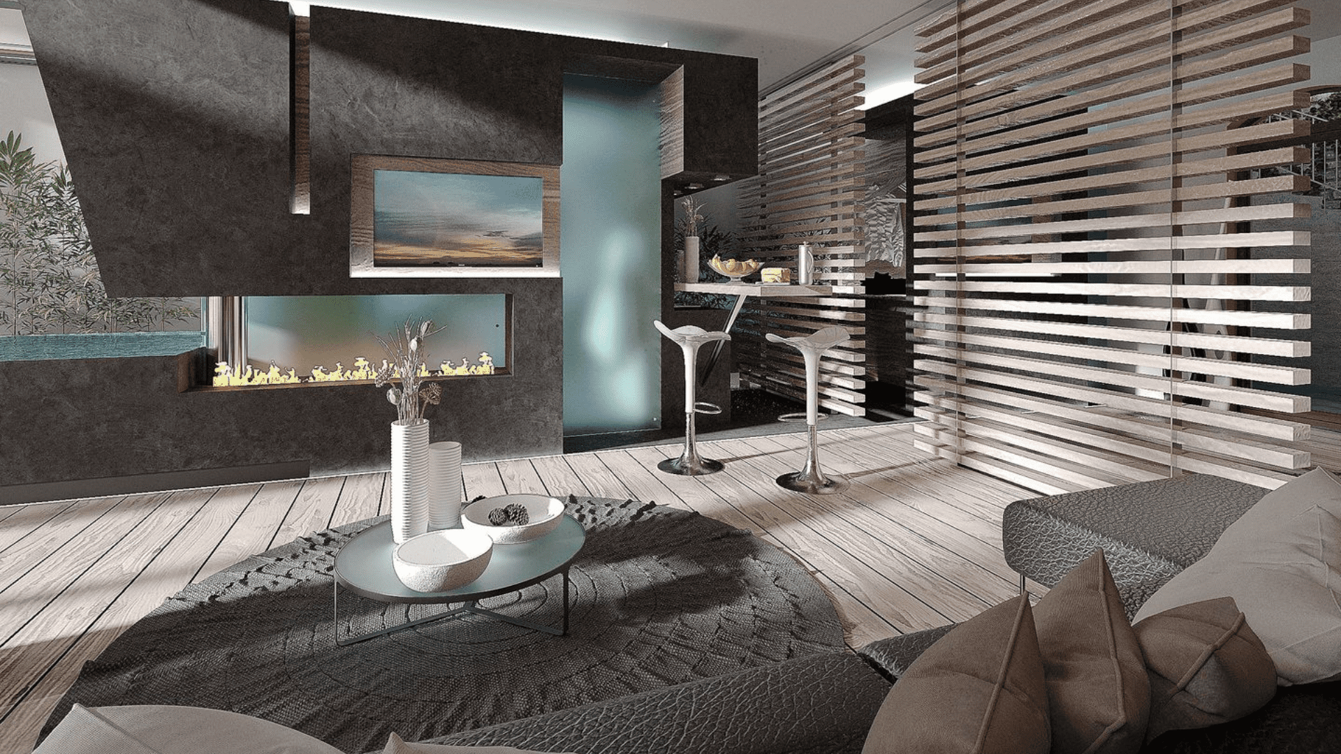 Una caratteristica peculiare del progetto è la fascia lineare che ospita le funzioni più specializzate (spa, caminetto, WC e bidet, cabina armadio, angolo cottura, infinity pool, BBQ, salotto esterno) in un unico elemento, concepito come un foglio piegato e tagliato. Realizzato in cartongesso anti-umido e rivestito con materiali plastici come resine e pitture effetto pietra, questo ‘service block’ garantisce privacy e intimità grazie all’utilizzo di vetri temprati opalescenti con Smart Film, che possono diventare opachi con un semplice interruttore.