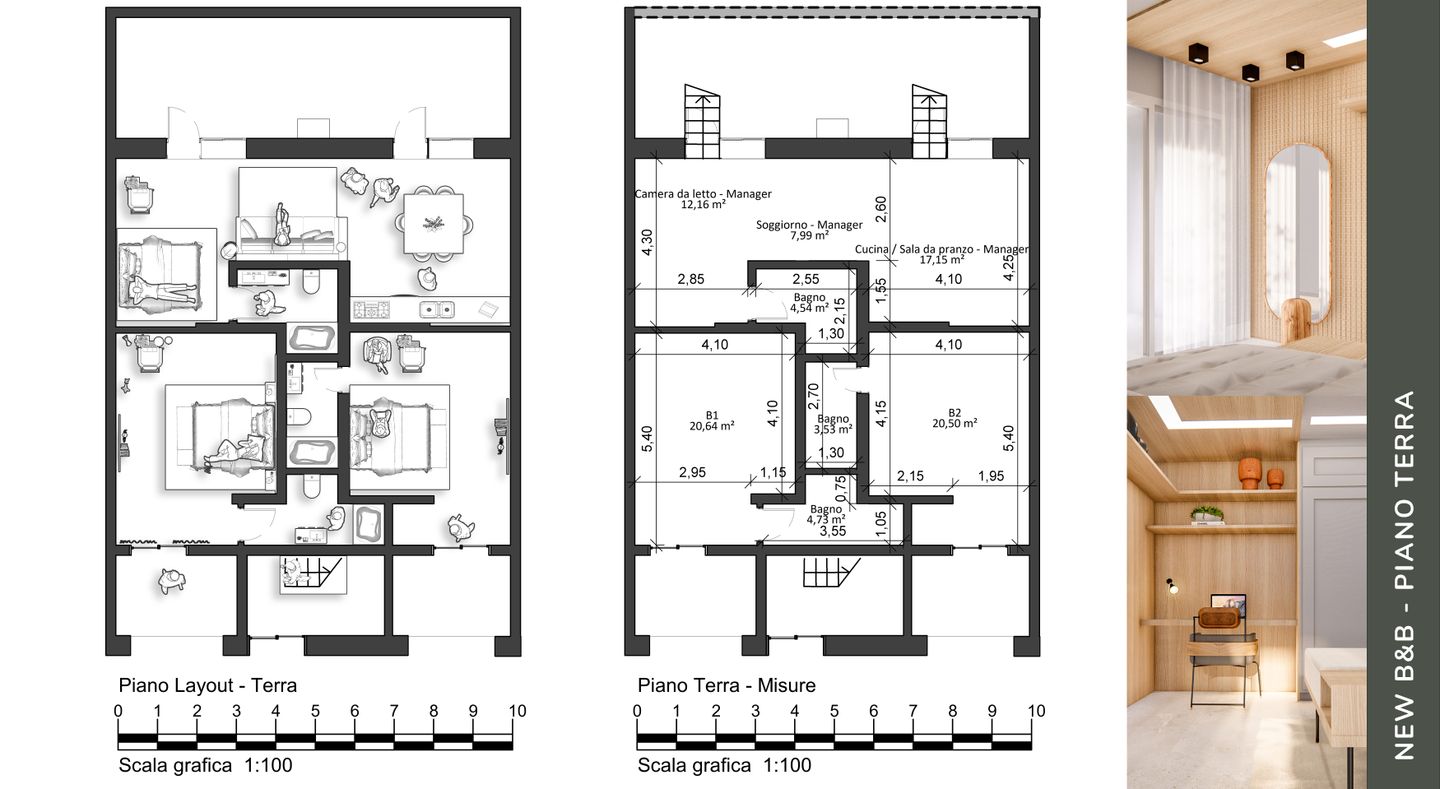 Il piano terra, attualmente adibito a B&B, ospita 4 camere e 4 bagni. Il progetto di ristrutturazione prevede la trasformazione di questi spazi in due camere di livello, sfruttando l’ampiezza del piano e la luminosità naturale.