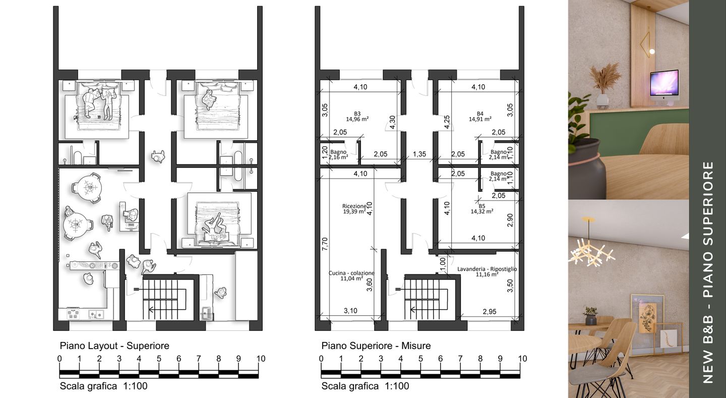Al piano superiore, l’obiettivo è quello di realizzare due camere ad uso ricettivo che siano funzionali e confortevoli. Lo spazio dedicato al gestore sarà ricavato da un piccolo angolo della casa, mentre la lavanderia e il deposito saranno posizionati in un locale adiacente.