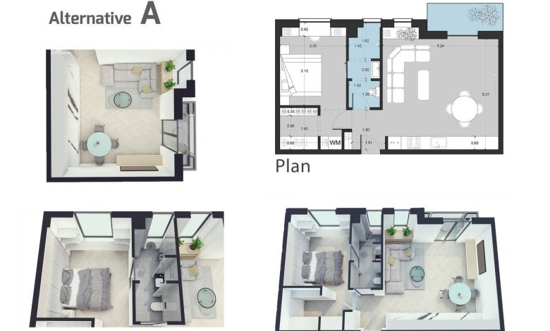Nella prima alternativa (A), la priorità è stata quella di aumentare la qualità dello spazio del living progettando spazi comunicanti. A tal fine, è stato progettato uno spazio aperto che comprende un soggiorno e una cucina collegati alla terrazza.