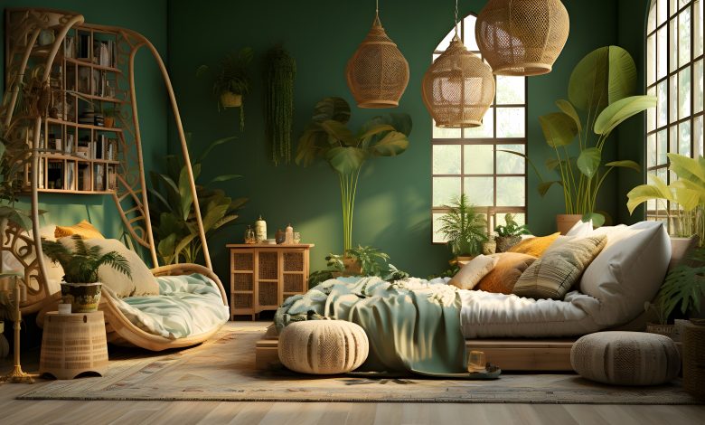 • Camera da letto: dipingi le pareti di un colore verde intenso. Scegli un letto con testiera in bambù e copriletto con stampa floreale. Aggiungi un tappeto in juta e un paio di comodini in legno.